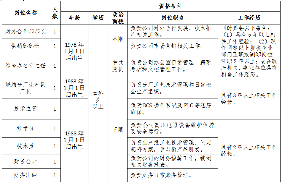 按照新材料公司薪酬管理辦法執行。經考核合格,對外合作部部長、供銷部部長薪資待遇不低于14萬元/年,綜合辦公室主任、燒結分廠生產副廠長薪資待遇不低于12萬元/年,技術主管薪資不低于10萬元/年,技術員、財務會計、財務出納薪資不低于8萬元/年,繳納“五險一金”。